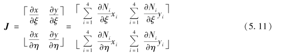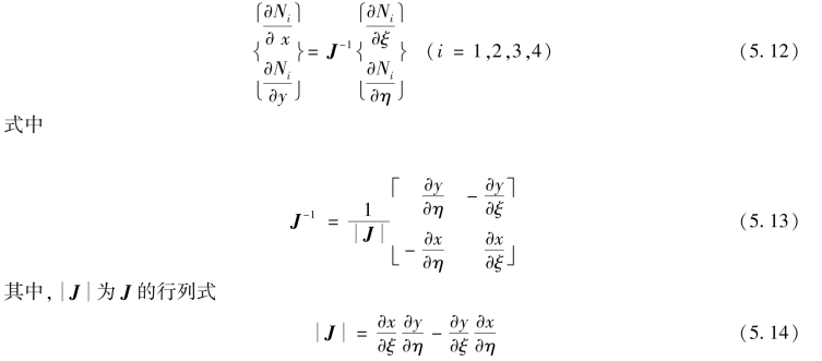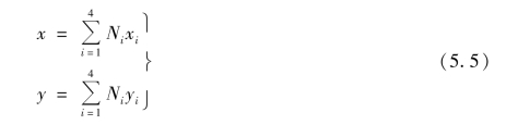 如图5.3(b)所示为整体坐标系的任意四边形单元,同样设置4个结点,对两种坐标系采用式(5.5)进行变换: