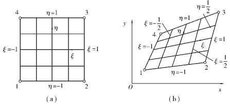 采用坐标变换式(5.4)后,xy平面内任意的四边形单元都可以映射成ξη平面上的正方形母单元。且直线仍映射为直线,仅其长度和位置发生了转化,故称该种变换为线性变换,子单元为线性等参元。