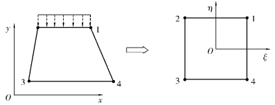 本节以平面4结点平面等参单元为例,介绍等参单元的坐标变换、单元位移函数的构造、单元刚度矩阵和等效结点荷载的计算等。