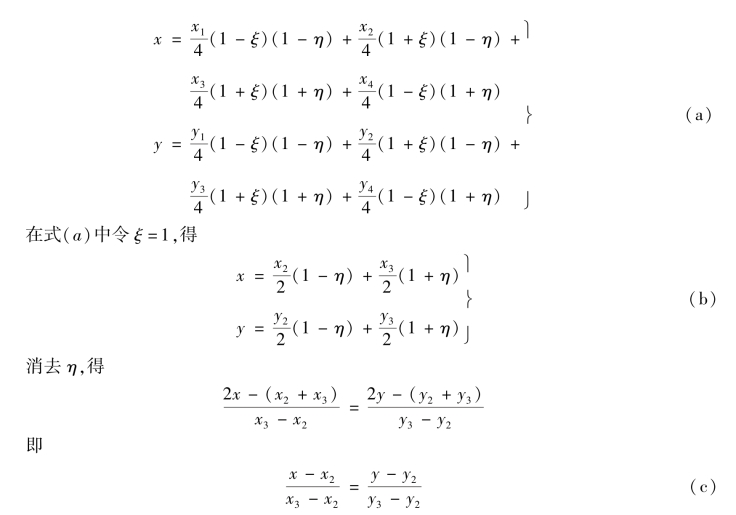 式(c)即为xy平面内通过结点2,3的直线方程。同理,可以推得任意四边形子单元其他3条边与母单元中ξ=-1,η=±1边一一对应,且子单元形心与母单元形心对应。
