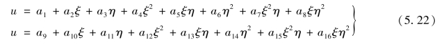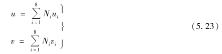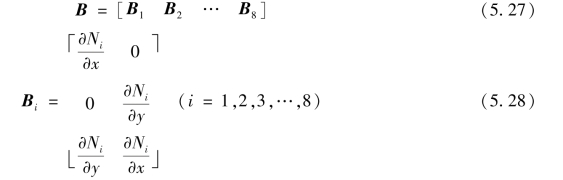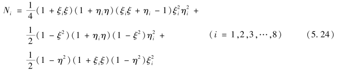 式中,Ni(ξ,η)为位移插值函数中的形函数,由式(5.24)表示。