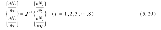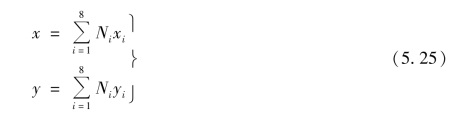 由式(5.25)可以看出,通过坐标变换,图5.6(b)整体坐标x,y中的曲边四边形映射为图5.6(a)局部坐标ξ,η中的正方形单元。曲边四边形的4个角点1,2,3,4与正方形的4个角点1,2,3,4一一对应,曲边四边形的4个边中点5,6,7,8与正方形的4个边中点5,6,7,8一一对应,曲边四边形中相应的点(x,y)与正方形中任意点(ξ,η)一一对应。