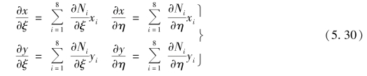 由式(5.25)可得整体坐标x,y对自然坐标的ξ,η偏导数