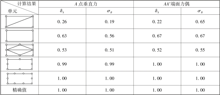 表5.1中给出了采用常应变三角形单元、矩形单元以及等参数单元计算如图5.7所示平面悬臂梁在两种荷载作用下的结果。可见,用1排矩形单元或2排三角形单元计算的误差还是相当大的,使用1排8结点等参数单元就可得到满意的计算结果。