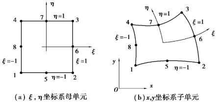 对于图5.6(b)中为整体坐标x,y中的任意8结点曲边四边形单元,建立一个与此单元对应的边长为2的8结点正立方体单元,并在其形心位置建立局部坐标系ξ,η,如图5.6(a)所示。将此单元作为母单元。