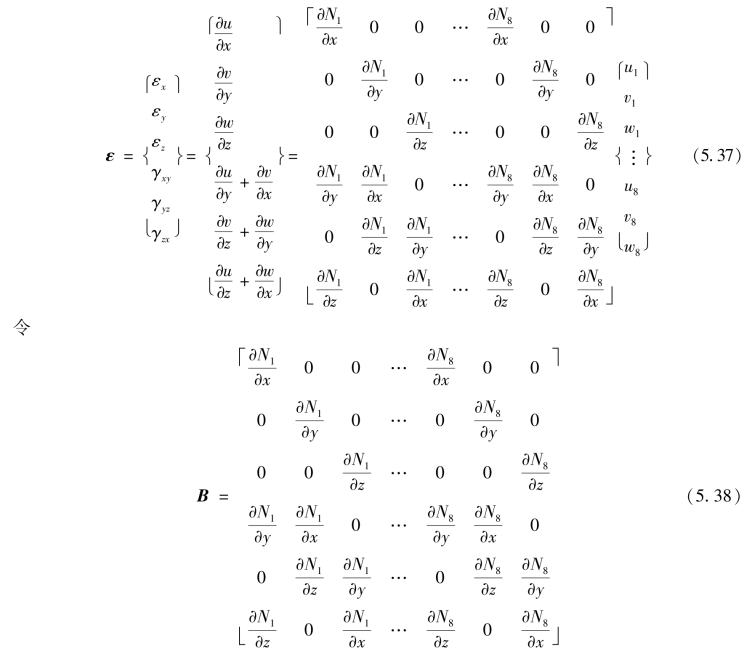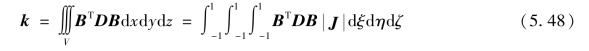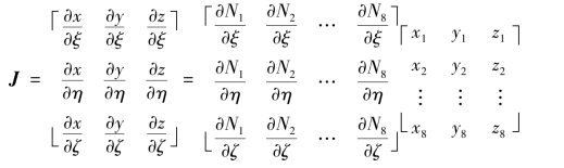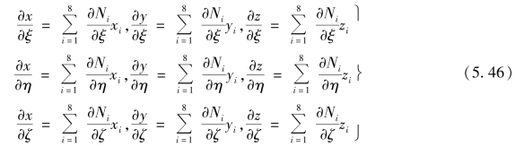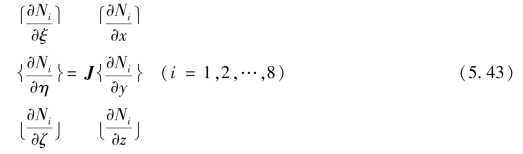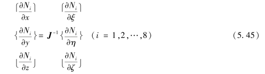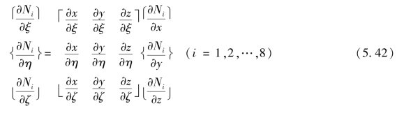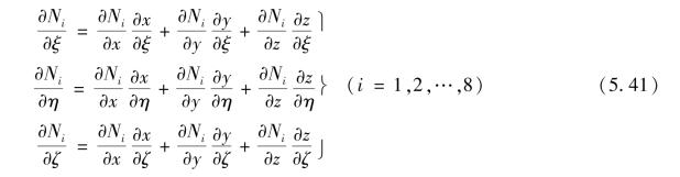 由式(5.38)可以看到,矩阵B中的元素是形函数对整体坐标x,y,z的偏导数,而形函数是局部坐标ξ,η,ζ的函数,所以,要计算形函数Ni对x,y,z的导数,需要进行坐标变换。