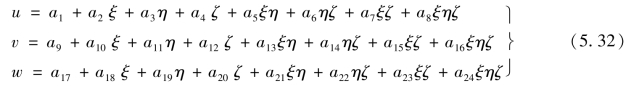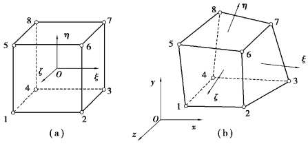 图5.9(b)为一个任意8结点六面体单元,与平面问题类似,建立一个与此单元对应的边长为2的8结点正立方体单元,并建立局部坐标系ξηζ,坐标原点在正立方体的形心,如图5.6(a)所示,此即母单元。