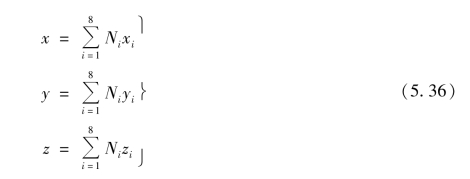 坐标变换式(5.36)使实际的任意8结点六面体子单元[图5.6(a)]与8结点正立面体母单元[图5.6(b)]的8个角结点一一对应,子单元6个平面、12条直边与母单元6个平面、12条直边一一对应,并使子单元内各点与母单元各点一一对应。这样相当于把实际的任意六面体子单元映射为正立方体母单元。