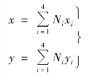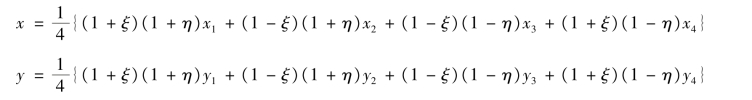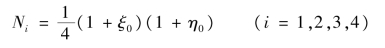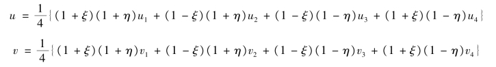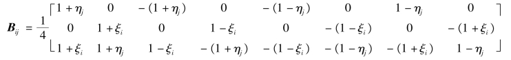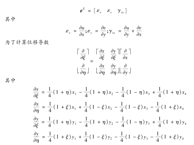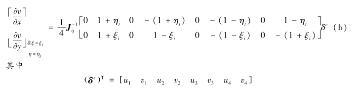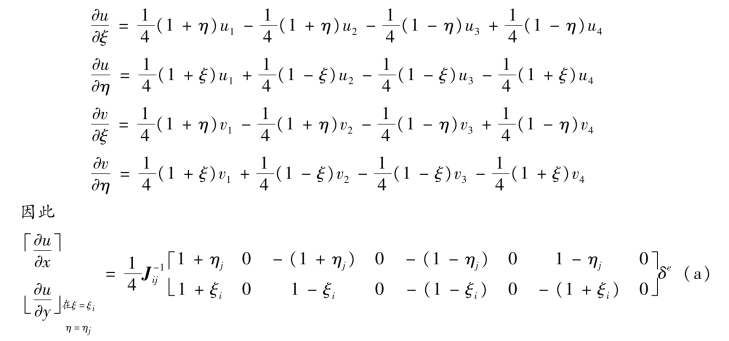 在实际应用中,应该注意到在计算Jij,式(a)和式(b)定义的位移导数矩阵时,只需要插值函数N1,…,N4的8个可能的导数。因此,最好是开始计算Bij时就计算点(ξi,ηj)对应的导数,且在任何需要它们的时候使用即可。
