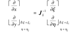 因此,对于-1到1中的任意ξ和η都可以使用表达式∂x/∂ξ,∂x/∂η和∂y/∂ξ,∂y/∂η构成Jacobi算子J,假设在ξ=ξi和η=ηi处计算J,而用Jij表示算子J,det J表示行列式,则有