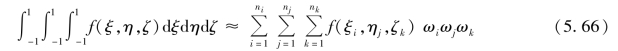 对于二维、三维数值积分,积分点数在不同的坐标方向上可以根据具体情况取不同的值。同样,如果f(ξ,η,ζ)是不高于2n-1次的多项式,则式(5.65)和式(5.66)积分的计算是精确的。