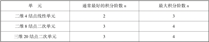 可以证明,收敛性所要求的数值积分的最低阶数,就是算出单元体积所用的阶数。也就是说最低阶数应当取决于的表达式中多项式的次数。但计算实践表明,利用低阶积分法则,可以降低单元的刚度,以补偿由于假定位移场引起的结构过于刚硬的情况。各种单元的最佳积分法则通常用试凑和经验来确定。表5.3给出推荐的高斯积分计算的阶数,其在实际应用中已经证明是有效的。