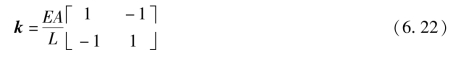 由上述分析看到,2结点杆单元的单元应变、应力都是常数。单元刚度矩阵元素也是常数。每个矩阵元素的物理意义与前几章的单元相同,即任一元素kij表示,当第j个结点位移方向上产生1单位的位移,而其他结点位移皆为0时,需要在第i个位移方向上施加的结点力的大小。例如,对于图6.1所示的杆单元,式(6.22)中的元素k11表示当结点1产生1单位的位移而结点2位移为0时,需要在结点1上施加的结点力为(EA)/L,这正是直杆的轴向线刚度。刚度元素分正负,这也是容易理解的,比如k12表示当结点2产生1单位的位移而结点1的位移为0时,需要在结点1上施加的结点力为-(EA)/L,即在结点2上产生一个正的单位位移,要使结点1保持不动,那么就要在结点1上施加负方向的力。杆单元刚度矩阵的物理意义是很容易理解的,如果说前面对二维、三维单元刚度矩阵的物理意义理解欠深刻的话,那么现在通过杆单元的推导就应该很清楚了,因为它们的物理意义是相同的。