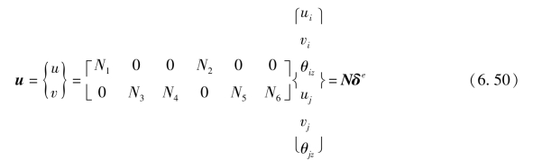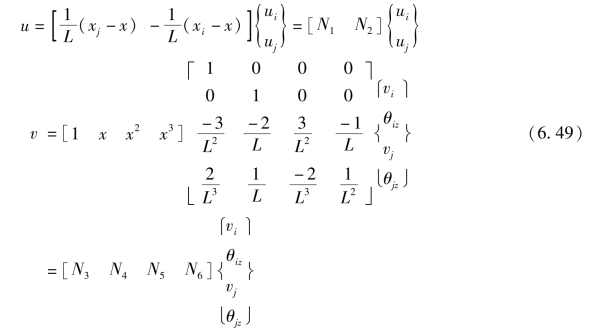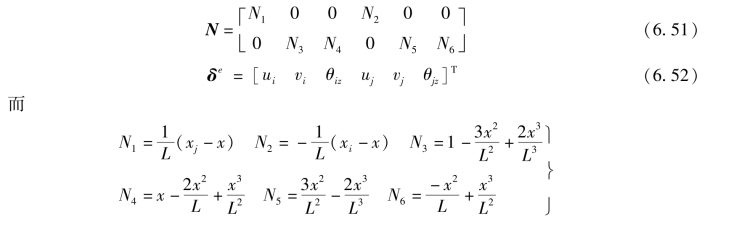 单元的每个结点有3个广义位移——沿x和y方向的位移u和v以及绕z轴的转角θz,每个单元沿梁的轴线方向只有2个轴向结点位移——ui,uj,所以单元的轴向位移取坐标的线性函数。而每个单元与y向位移有关的结点位移有4个——vi,θiz,vj,θjz,所以单元的y向位移取坐标的3次函数,即