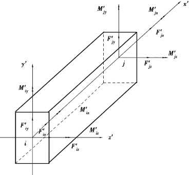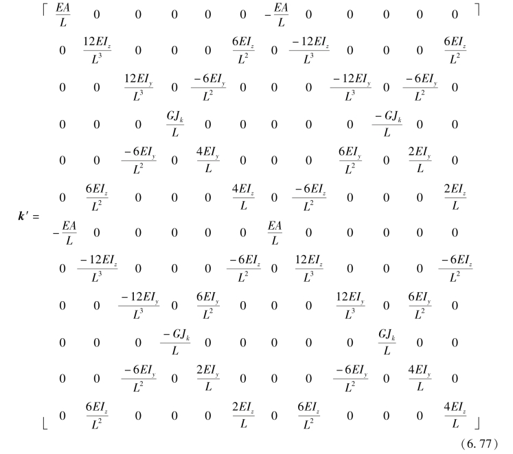 在式(6.77)中,A为横截面面积,L是单元长度,Iy和Iz分别为横截面对y',z'轴的主惯性矩,Jk是扭转惯性矩,E和G是弹性模量和剪切模量。