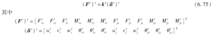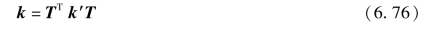 其中,k'是局部坐标系下的三维梁单元的刚度矩阵,见式(6.77),T是三维转换矩阵,转换矩阵可以根据单元的总体结点坐标求出,具体计算方法可参考有关文献。