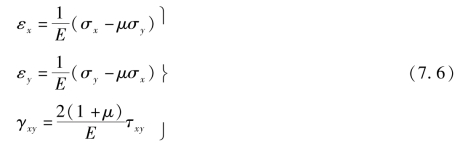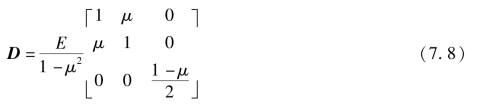 在薄板的小挠度弯曲理论中,放弃了关于εz,γzx和γyz的物理方程,即物理方程(1.14)中的第三、第五和第六式。根据基本假定(3),因为不计σx所引起的形变,所以薄板的物理方程为