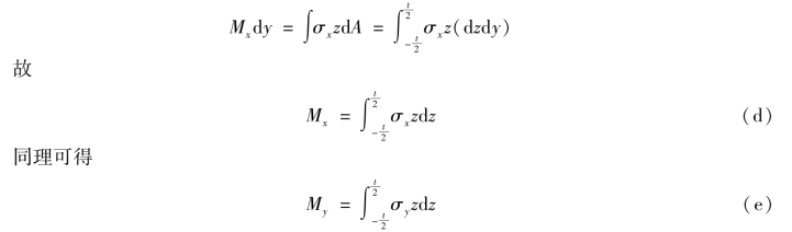 由图7.2(a)可看出,在垂直于x的横截面上,正应力σx合成一个力偶,这个力偶的矩为这个横截面的弯矩。用Mx表示单位宽度上的弯矩[图7.2(a)],则得