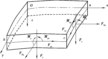 ②Fxy,Fyx以与x,y轴正方向的夹角减小为正,反之为负;当Fx,Fy作用在法向与x,y轴正方向相一致的截面上时,与z轴的正方向一致为正;Mx,My以使z=的曲面产生拉应力时为正;Mxy使O点及其对角c点翘向z轴的负方向为正。