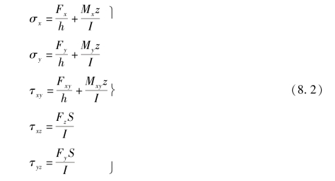 式中内力FNx,FNy,Fxy引起的应力沿厚度均匀分布。弯矩Mx,My,Mxy引起的应力沿厚度线性分布,在中面为零,在两表面达到最大正、负值。横剪力Fx,Fy引起的剪应力沿厚度为抛物线分布,在中面为最大,在两表面为零。