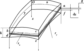 考察一壳体的微元体,如图8.1所示,Oabc是它的中面,Oxyz为建立在中面上的右手坐标系,z轴为中面法线,x,y轴与中面相切。与平板微元体不同,壳体的微元体是曲状的,中间在x向和y向的曲率半径为rx,ry。