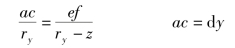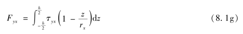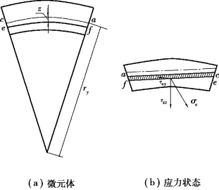 现在,考察微元体截面上的内力,先看ac截面,在图8.2(a)中,为清晰起见,把ac截面的形状画得不是协调的。在z方向,截面有厚度h,而在宽度方向(ac方向或y方向)截面只具有微元体的长度,因此ac截面的形状应是厚度大大超过宽度。作用在ac截面上的应力,沿着y方向可以看成是不变的,而仅仅沿着z方向变化。由此,将ac截面看成是由一些平行于ac的“窄条”组成,图中示出典型的窄条ef,它与中面ac中距离为z,厚度为dz。ac截面并不是一个矩形,而为圆环的一部分。由关系式