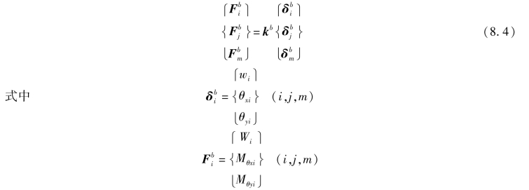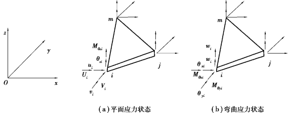 对于弯曲应力状态,单元应变状态取决于结点在z方向的线位移w,绕x轴转角θx及绕y轴转角θy,结点力和结点位移的关系如下:
