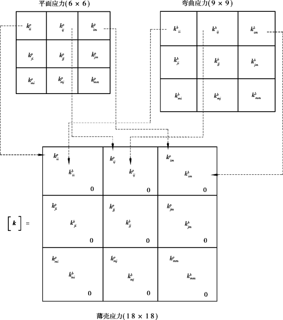 图8.5 由平面应力和薄板弯曲的刚度矩阵组成薄壳单元刚度矩阵