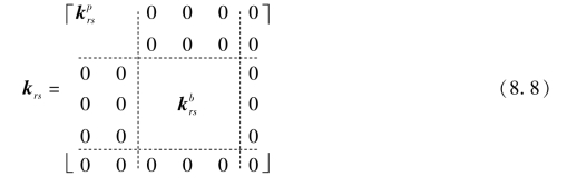 因此,把平面应力问题和薄板弯曲问题中三角形单元刚度矩阵结合起来,即可得到组合应力状态下三角形单元的刚度矩阵,如图8.5所示。对于矩形薄壳单元,这种组合方法也是适用的,只是刚度矩阵是24×24阶的。