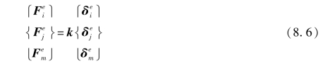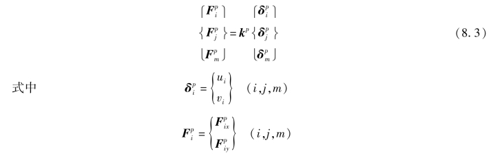 对于平面应力状态,由第2章可知,单元的应变状态完全取决于各结点的位移u和v,以三角形单元为例,单元的等效结点荷载与结点位移的关系如下: