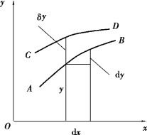 则增量δy称为函数y(x)的变分。显然,δy一般也是x的函数。在图B.1中,用CD表示相应于新函数Y(x)的曲线,并示出变分δy。