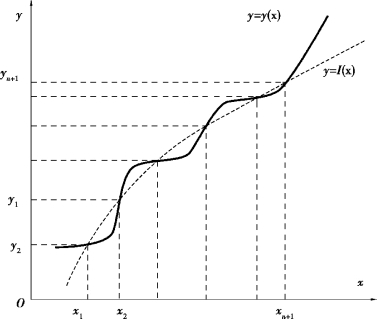 从几何上看,插值法就是求曲线y=I(x),使其通过给定的n+1个点(xi,yi),(i=1,…,n+1),并用它近似已知曲线y=y(x),如图A.1所示。