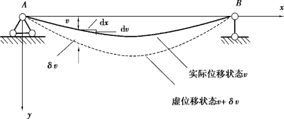 例如,图B.4中的梁在外力作用下的实际位移为v,它满足平衡微分方程、位移边界条件和应力边界条件。假设在实际位移状态附近发生了约束条件(位移边界条件)容许的虚位移δv,则梁进入邻近的虚位移状态v'=v+δv。由于虚位移时满足约束条件的,因此在边界的约束处,即点A和点B,δv=0。