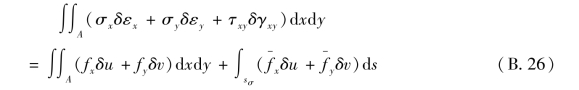 应用位移变分方程,还可以导出另一个重要方程,即弹性力学的虚功方程。为此,将δU用式(B.20)表示,再代入位移变分方程(B.21),得到虚功方程