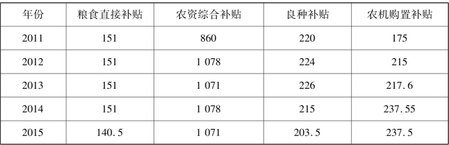 表2.2 2004—2015年四大农业直接补贴额(单位:亿元)