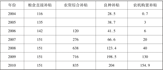 2004年以来,我国开始制定和实施粮食直接补贴、农资综合补贴、良种补贴、粮食最低收购价等一系列强农惠农政策,主要目标是促进粮食生产和农民收入增加。这使农业实现了全面支持和保护政策,形成了新时期农业补贴的制度框架。一方面,粮食直接补贴、农资综合补贴、良种补贴实施时间长、范围广、惠及面大且力度大(表2.2);另一方面,这三项直接补贴措施是现阶段农业补贴政策的重要组成部分。因此,本书只对粮食直接补贴、农资综合补贴和良种补贴这三大直接农业补贴的实施现状进行阐述和分析。