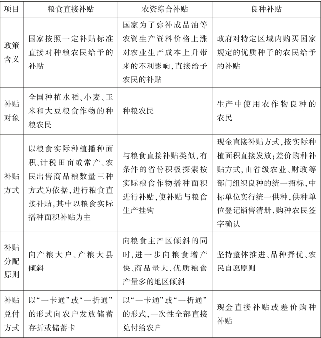 为了更好地认识粮食直接补贴、农资综合补贴、良种补贴政策,现将这三种主要农业补贴政策进行总结、比较。其结果如表2.3所示。