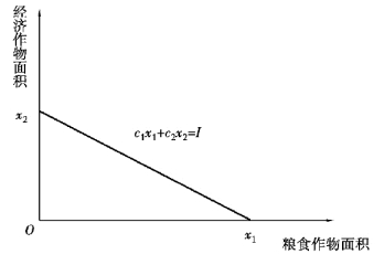 其中,I为收入,x1和x2分别为粮食作物和经济作物的播种面积,c1 x1是农户种植粮食作物的成本总额,c2 x2是农户种植经济作物的成本总额。农户的等成本线要求投入在这两种产品中的成本总额等于农户的农业预算支出。