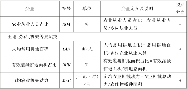 根据相关理论及文献,本书选取第一产业占比、粮食价格、农业从业人员占比、人均常用耕地面积、有效灌溉耕地面积占比、亩均农业机械动力等指标作为控制变量。具体定义与说明如下: