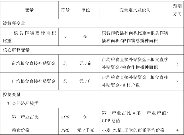 本书选取粮食直接补贴资金作为核心解释变量,与此同时,为了从人口、土地等两个维度分析粮食直接补贴的作用,将其分为户均和亩均粮食直接补贴资金。一般而言,粮食直接补贴资金越高,农户种植粮食的意愿越强烈,粮食作物播种面积就会越大。
