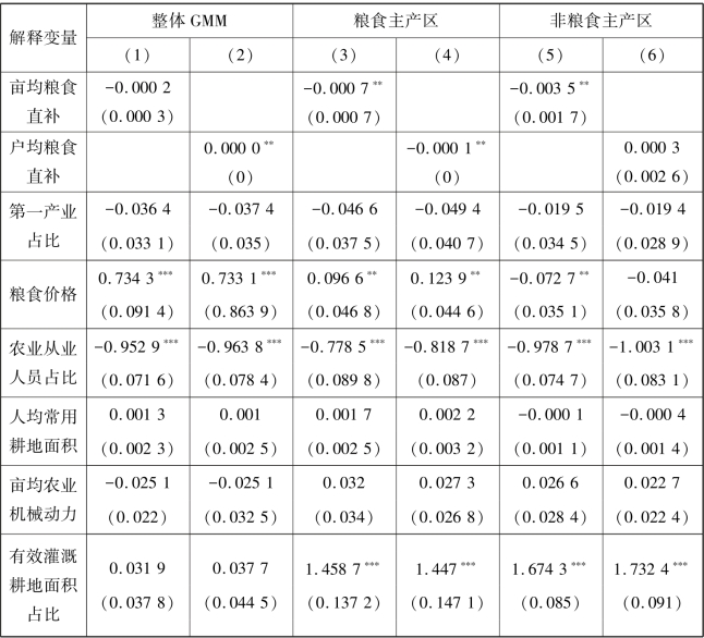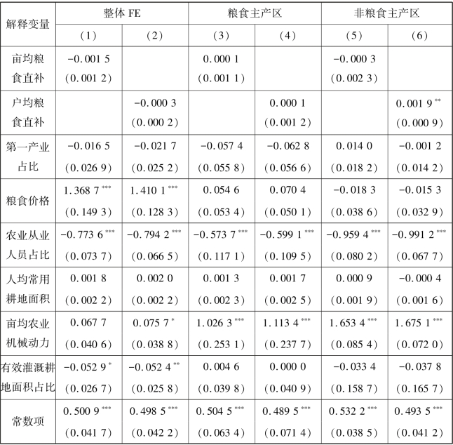 具体的效应机制可能是,一方面,随着我国城镇化、工业化的推进和发展,地方政府更加注重第二、第三产业的发展,从而导致更多的劳动力、资金从农业向工业、服务业转移;再加上粮食直补分摊到每户种粮农民手上的金额不多,由于种粮机会成本太高,往往被看作对年迈劳动力的“养老金”,对年轻劳动力也没有吸引和激励机制。另一方面,生产粮食并不是非粮食主产区的支柱产业,粮食的生产和发展在一定程度上不能够适应当地的地理特征和气候特点,如果执意过度开发粮食耕地,很有可能导致滑坡、泥石流等自然灾害发生,不利于当地生态的可持续发展,反而会人为地增加自然灾害发生的可能性,因此在客观上粮食直补无法促进粮食播种规模的扩大。但值得注意的是,无论在粮食主产区还是在非粮食主产区,都没有通过显著性检验,粮食直接补贴对粮食作物播种面积的影响非常小,几乎接近为0,即无论粮食主产区还是非粮食主产区,粮食直接补贴对粮食作物播种面积都无影响。