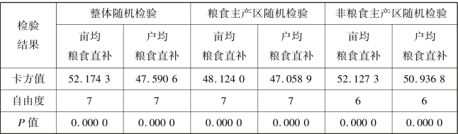 关于面板模型,首先采用Hausman检验确定应选择随机效应模型还是固定效应模型。为全面分析粮食直补对粮食作物播种面积的影响,本章将粮食直补分别用亩均粮食直补和户均粮食直补来进行Hausman检验,结果如表4.3所示。无论是每亩粮食直补还是每户粮食直补,Hausman检验统计量在显著水平为1%时都拒绝原假设,即个体效应和解释变量无关,应抛弃随机效应模型,即两种粮食直补政策的效果分析均须采用固定效应模型。此外,无论是粮食主产区还是非粮食主产区的Hausman检验,都在1%的显著水平下拒绝原假设,因此,在进行粮食主产区和非粮食主产区粮食直接补贴对粮食作物播种面积的影响分析时也采用固定效应模型。