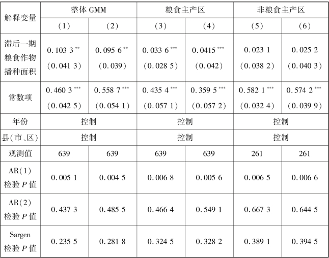 为进一步验证上述结果具有稳健性,我们在多元回归模型中引入粮食作物播种面积一阶滞后项,构建一个动态面板数据模型。本章采用系统广义矩估计方法对其进行估计,同时对估计结果进行Sargen检验,以验证工具变量的有效性,并对残差项是否存在一阶和二阶序列自相关进行了检验。系统广义矩估计具体可分为一步法和两步法。与一步法相比,两步法不易受到异方差的干扰,但两步法的标准误差在有限样本条件下可能产生向下偏倚。为此,本章遵循Windmeijer(2005)的方法对两步法标准差的偏差进行校正。表4.5给出的系统广义矩估计结果与固定效应模型中解释变量的符号和显著性基本一致,表明本书结论对不同的计量回归方法都是稳健的。从检验结果上看,AR(1)检验的P值均小于0.1,表明残差项存在显著的一阶自相关,而AR(2)检验的P值均大于0.5,表明残差项不存在二阶自相关,符合模型的设定条件;Sargen检验的P值均大于0.1,说明残差项与解释变量不相关,工具变量是合理的。另外,表4.5中粮食作物播种面积一阶滞后项的估计结果表明,粮食作物播种面积存在显著的持续性特征,故而上述结果再次证实了本章实证结果具备稳健性。