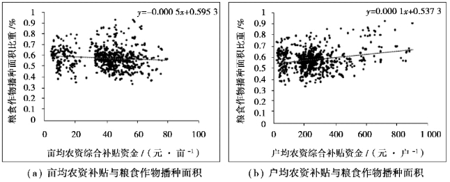 农资综合补贴与粮食作物播种面积之间不相关。本书分别做出2006—2015年71个县区市单位粮食作物播种面积农资综合补贴资金和户均农资综合补贴资金与粮食作物播种面积之间统计意义上的线性关系图(图5.3)。从图5.3中可以看出,亩均农资综合补贴资金与粮食作物播种面积存在着微弱的负相关关系,户均农资综合补贴资金与粮食作物播种面积存在极小的正相关关系,亩均和户均农资综合补贴资金对粮食作物播种面积的影响存在着一定的差异性。但由于亩均和户均农资综合补贴资金均与粮食作物播种面积之间的系数非常小,整体而言,农资综合补贴资金与粮食作物播种面积之间不相关,即随着粮食直接补贴资金的增加,粮食作物播种面积不会增加或者减少。