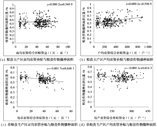 本小节选取的被解释变量为粮食作物播种面积比重,是为了反映出在农资综合补贴的作用下,农户种植粮食作物的意愿和效果,即农户的种粮积极性。关于核心解释变量,本小节采取两个维度进行测度,即亩均农资综合补贴金额和户均农资综合补贴金额,进一步探究农资综合补贴金额对粮食作物播种面积的影响。