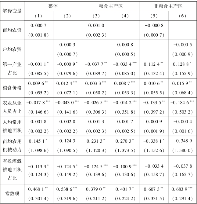 分区域看,无论是在粮食主产区还是在非粮食主产区,农资综合补贴对播种面积的影响都未通过显著性检验。在粮食主产区,亩均农资综合补贴和户均农资综合补贴均对农业播种面积具有正影响,但影响系数非常小,接近于0,这与理论假设相一致,即在粮食主产区农资综合补贴对农业播种面积没有影响。在非粮食主产区,亩均农资综合补贴和户均农资综合补贴均对农业播种面积具有负影响,这与前文分析也一致,但由于未通过显著性检验,则可知农资综合补贴对非粮食主产区播种面积也没有影响。此外,农用机械动力在粮食主产区对播种面积具有正影响,而在非粮食主产区对播种面积具有负影响;第一产业占比在粮食主产区对播种面积的影响为负,而在非粮食主产区对播种面积的影响为正。这种差异在很大程度上是由粮食主产区和非粮食主产区粮食生产条件造成的。