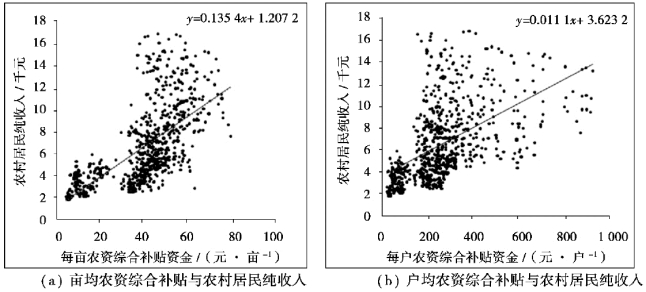 农资综合补贴与农民收入呈正相关关系。本书分别做出2006—2015年71个县区市单位粮食作物播种面积农资综合补贴资金、户均农资综合补贴资金与农村居民人均纯收入之间统计意义上的线性关系图(图5.5)。从图5.5中可以看出,单位粮食作物播种面积和户均农资综合补贴资金对农民收入的影响程度存在一定差异,但总体上,一个地区农资综合补贴资金与该地区的农民收入呈正相关关系,即随着政府对农资综合补贴资金投入金额增加,农民收入水平也会相应地增加。