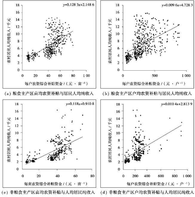农资综合补贴与粮食主产区和非粮食主产区农民收入都呈正相关关系。本书分别做出2006—2015年粮食主产区和非粮食主产区,单位粮食作物播种面积农资综合补贴资金、户均农资综合补贴资金与农村居民人均纯收入之间统计意义上的线性关系图(图5.6)。从图5.6(a)和图5.6(b)中可以看出,亩均和户均农资综合补贴资金对农民收入的影响存在着一定的差异,但整体上,粮食主产区农资综合补贴资金与该地区的农民收入呈正相关关系。从图5.6(c)和图5.6(d)中可以看出,非粮食主产区某地区的农资综合补贴资金与农民收入也呈正相关关系,即政府对农资综合补贴资金投入力度加大,农民收入也会不同程度增加。从图5.6(a)和图5.6(c)中可以看出,农资综合补贴资金对粮食主产区和非粮食主产区的农民收入的影响程度差异不大。