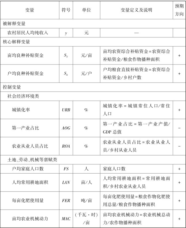 其中,yit为农村居民人均纯收入;Sit为亩均良种补贴、户均两种补贴;URBit为城镇化率;AOGit为第一产业占GDP比重;ROAit为农业从业人员占比,用农村从业人员占乡村从业人员的比重表示;FSit为户均家庭人口数;LANit为人均常用耕地面积,用常用耕地面积占粮食作物播种面积的比重表示;FERit为每亩化肥使用量;MACit为亩均农业机械动力。具体如表6.4所示。