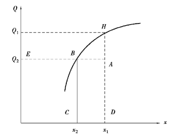 假设生产前沿为f(x),表示在不存在效率损失时可以达到最优生产的可能性边界。若横轴为农业补贴的投入x,当农业补贴投入x1与对应的生产前沿上的点为H,则可以实现的产出水平为Q1。注意,此过程中,可能存在技术水平滞后、管理上无效、规模不经济、各种损耗等原因,致使实际产出只能达到点A,与之对应的实际产出水平为Q2。关于效率的测度可以从两方面进行分析:一是基于投入视角,ba=x1-x2,农业补贴政策效率为,即反映的是当产出不变时,点A与生产可能性边界点B之间的距离。二是基于产出视角,由于最优产出水平为Q1,实际产出水平为Q2,那么产生损失为